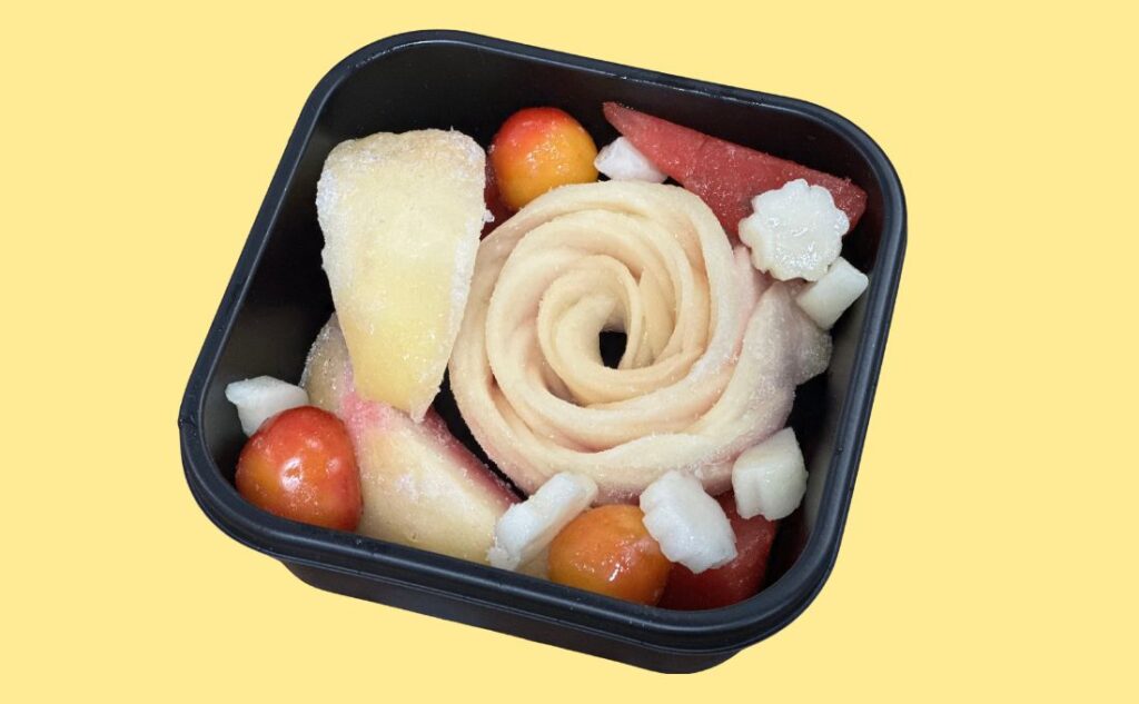 桃から作られた中央の花のまわりに、ペイズリーすいか、さくらんぼ、ラフランスが入っています